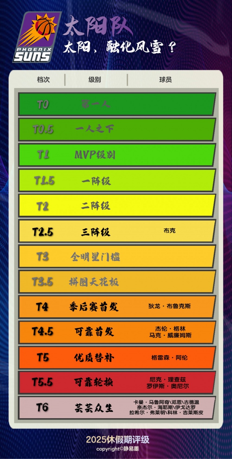 杜兰特交易完成后,太阳就不能犯错了。他们必须用剩余有限的资源获取尽可能优质的战力,并祈祷他们的核心团队足够健康,在杜兰特的合同期内完成对冠军奖杯的冲击。争冠从来不是100%的事情,但赌上一切的建队方式决定了,太阳不太好承受未达100%的那部分伤害;
